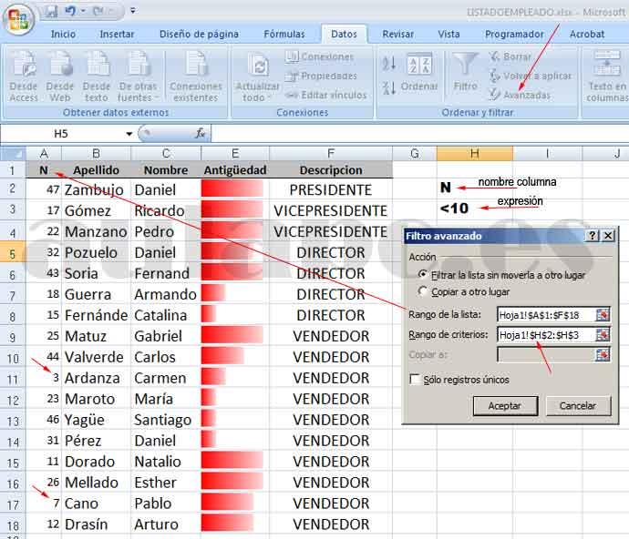 Vamos a ver cómo funcionan los filtros avanzado en excel.. Se muestra el cuadro de diálogo filtro avanzado en lugar del menú filtro automático. Haga clic de nuevo en filtro avanzado y en restablecer en el cuadro de diálogo para restablecer el filtro. En el vídeo veo que ponen como criterio algo como: Antes de aplicar el filtro avanzado debo seleccionar la tabla de datos (a4:d13) y posteriormente ir a la ficha datos y pulsar el botón avanzadas que se encuentra en el grupo ordenar y filtrar.. Los criterios avanzados se escriben en un rango de criterios separado en la hoja de cálculo y sobre el rango de celdas o la tabla que desea filtrar.